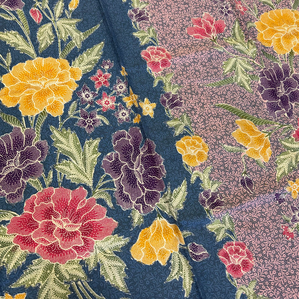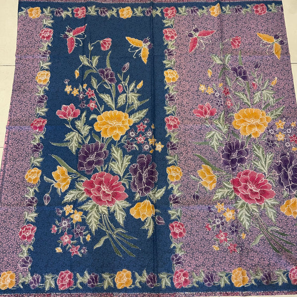 (Hand-stamped batik) Vintage Bouquet of flowers with Butterflies and Bloom Pink Blue