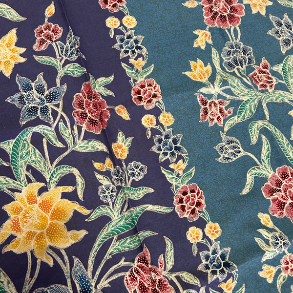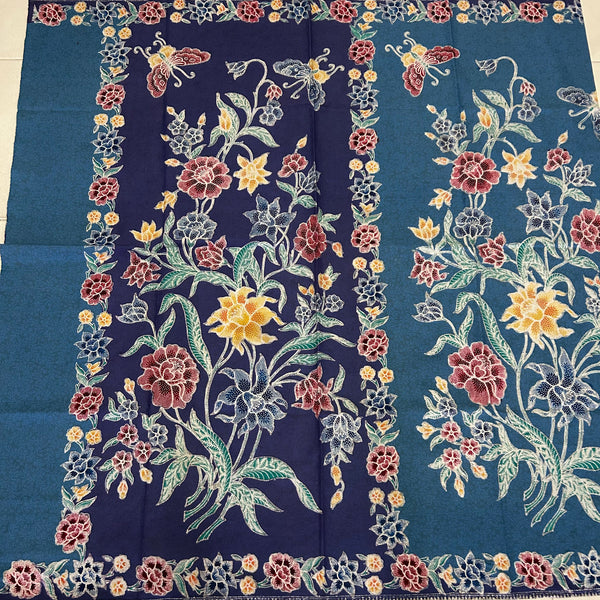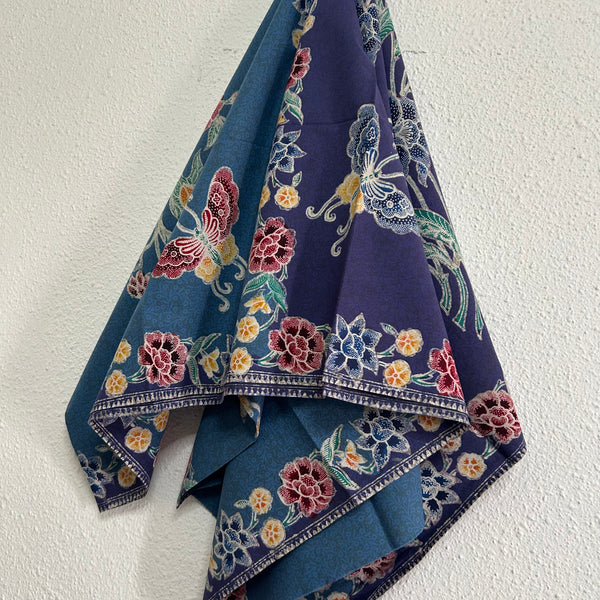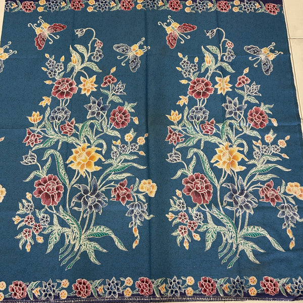 (Hand-stamped batik) Vintage Bouquet of flowers with Butterflies Blue #B
